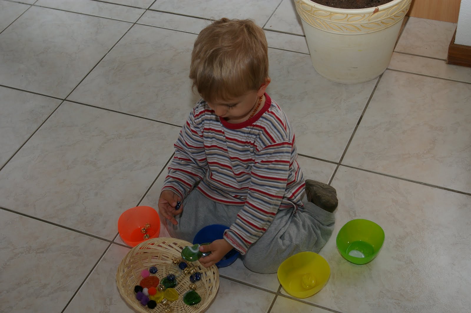 Quelques jours plus tard, je lui ai à nouveau proposé un tri de couleur et cette fois-ci cela a fonctionné! J’ai pris d’autres supports, un jeu de 4 boules de coton de quatre couleurs primaires… et Grégoire a tout de suite compris, l’a refait parfaitement, mais ne s’est tout de même pas attardé dessus… Il faudra donc quand même enrichir ce petit travail apprécié…