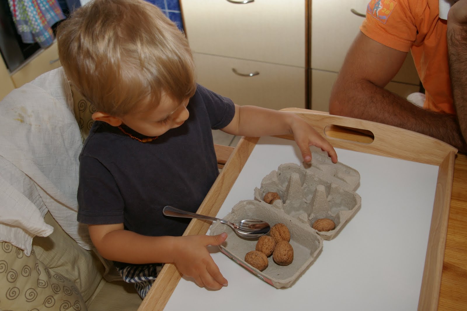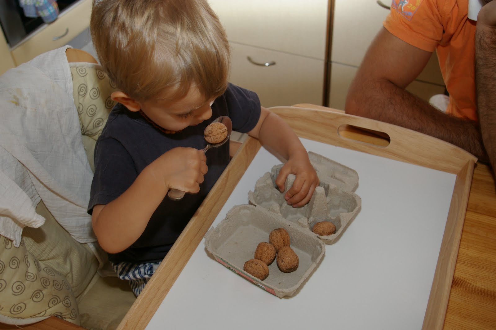 Une autre activité proposée consistait à mettre des noix avec une cuillère dans une boîte à œuf. Flop total… ca ne l’intéressait nullement….!