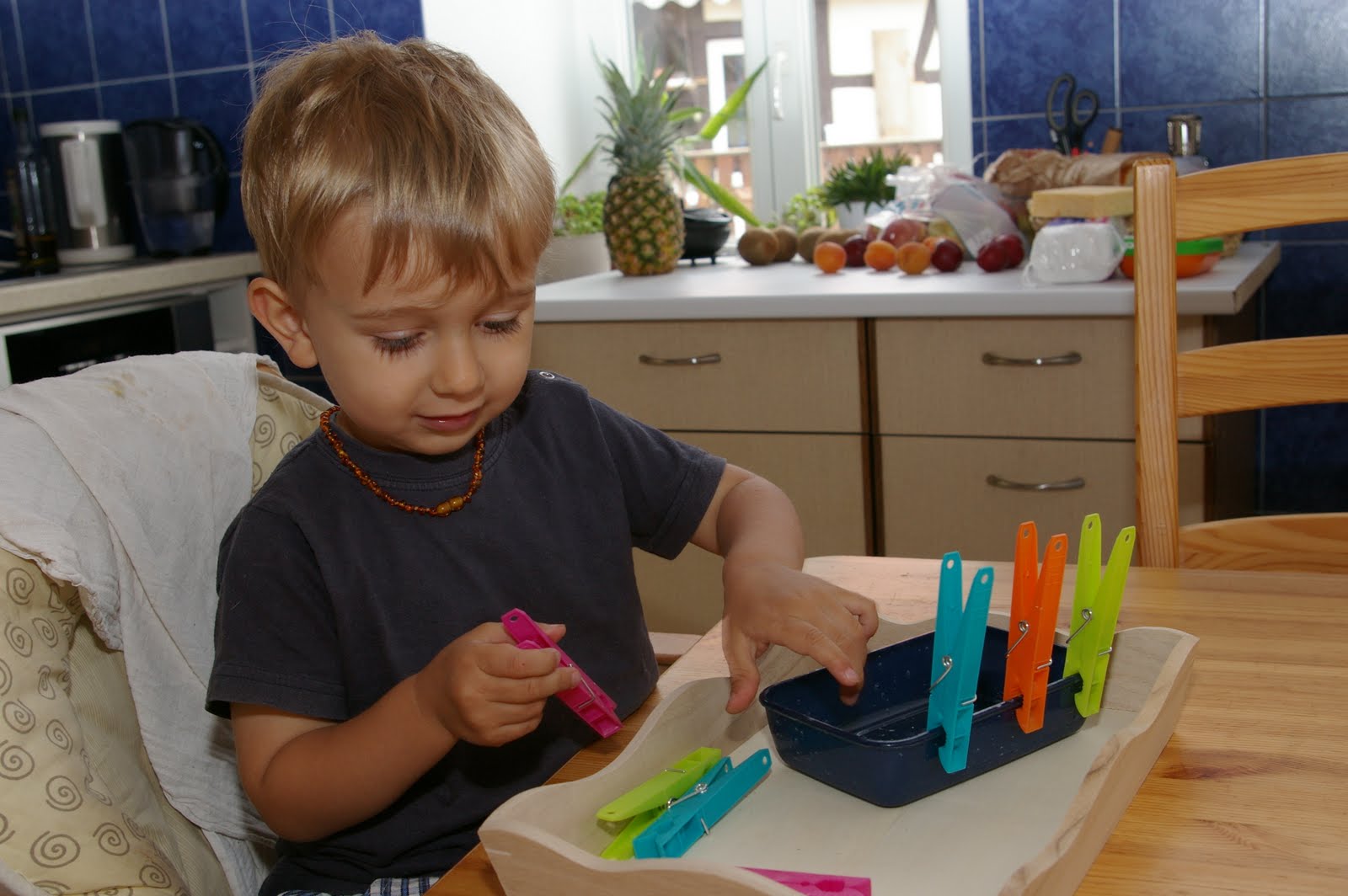 C’était une affaire compliquée de trouver les bonnes pinces à linges… Après en avoir acheté en bois (j’aime bien les choses en bois…) qui étaient trop dures à ouvrir pour les petites mains de Grégoire et des pinces toutes petites qui étaient tellement petites que Grégoire ne pouvait pas les ouvrir, j’ai finalement trouvé mon bonheur à la Foire Fouille: de grandes pinces colorées, en plastique (me voilà contredite…), qui s’ouvraient assez facilement.