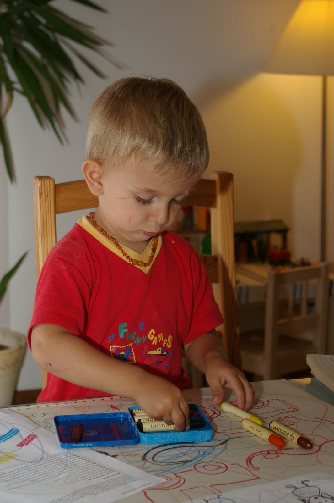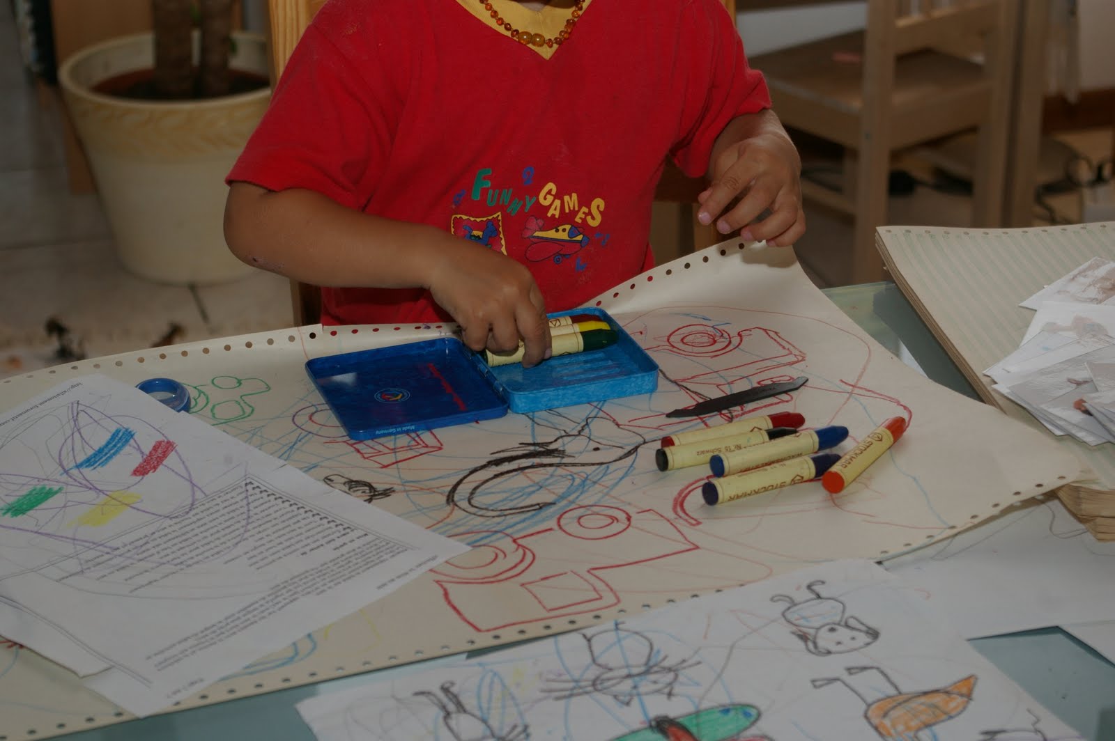 Après avoir dessiné des vaches, des tracteurs, des chiens, des poissons etc, lors du rangement, Grégoire m’a regardé ranger les crayons et lorsque j’ai voulu fermer la boite, il l’a prise pour ressortir les crayons et les reranger, fermer la boite et on recommence! Cela a du l’occuper un bon moment et depuis l’activité première de dessin a trouvé un complément: celle du rangement des crayons…