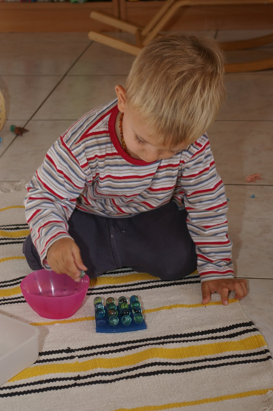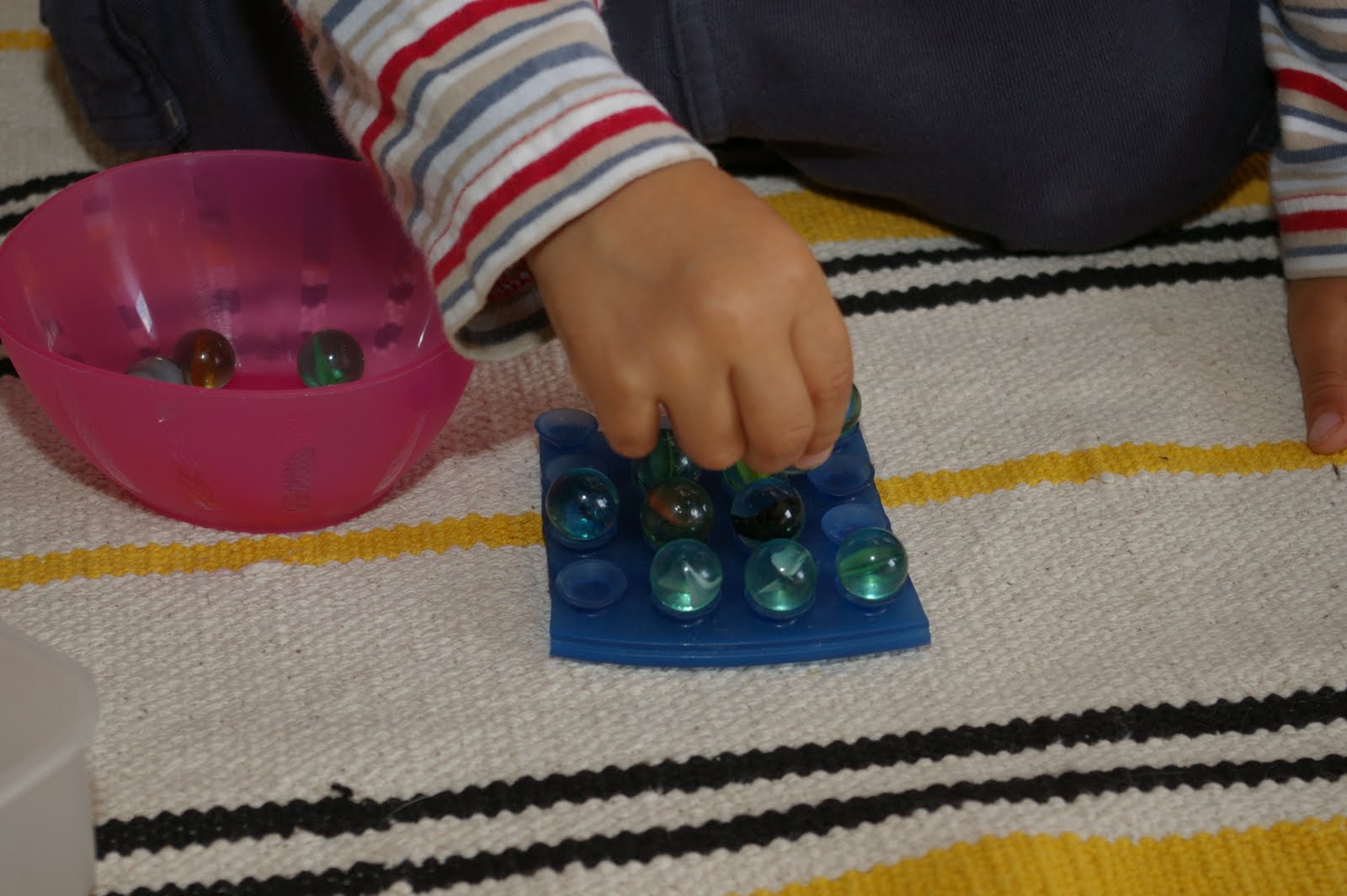 Au fil des semaines, sa motricité fine s’est développée et il aime bien maintenant mettre les billes sur la ventouse sans en faire tomber aucune…
