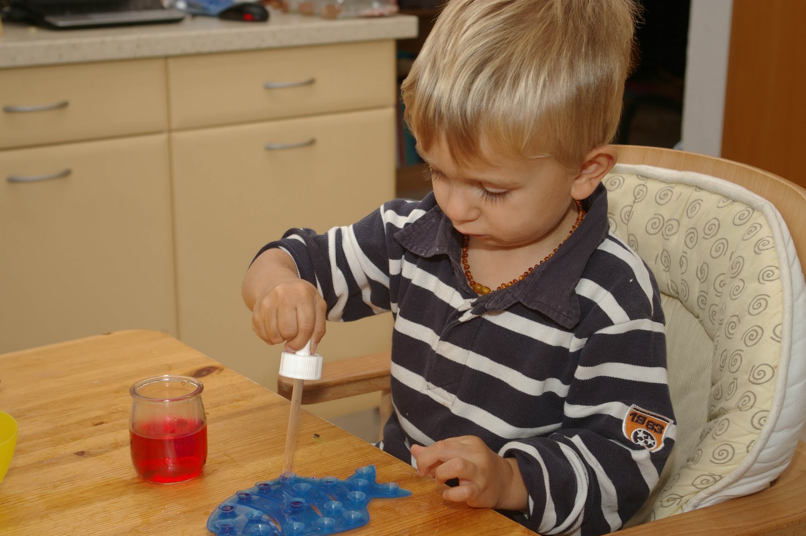 L’eau est toujours aussi attrayante…Sa magie opère à chaque coup… Comme cela fait un bon bout de temps que Grégoire n’a plus fait de versées d’eau, je lui ai proposé ce plateau qu’il a tout de suite manipulé. La petite éponge a servi de suite, puisque l’eau a un peu coulé le long des pichets. Les petites mains apprennent ainsi à nettoyer…