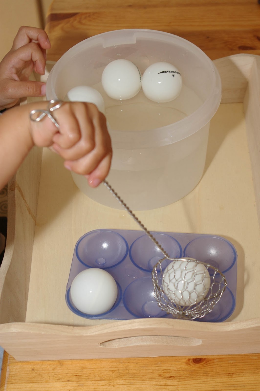 Verser sans cogner les pichets et tenir les pichets par la manche est encore perfectible… mais c’est pour cela que nous mettons à disposition de telles activités à nos enfants… D’ailleurs c’est une grande première, puisque c’est la première fois qu’un plateau “à eau” est en libre accès. J’ai jusqu’à présent toujours préparé les plateaux “à liquides” sur demande. Je les rangeais moi-même après utilisation… Mais Grégoire est très attentionné et il n’a pas encore détourné cette activité…Une petite bassine d’eau, avec les balles dedans, une boîte à œufs et l’écumoire pour pêcher les balles et les ranger ensuite dans la boîte à œufs. Grégoire a bien aimé cette activité, sauf que mon pauvre plateau en bois non traité a souffert… il faut vraiment que je trouve des plateaux qui supportent mieux l’eau…