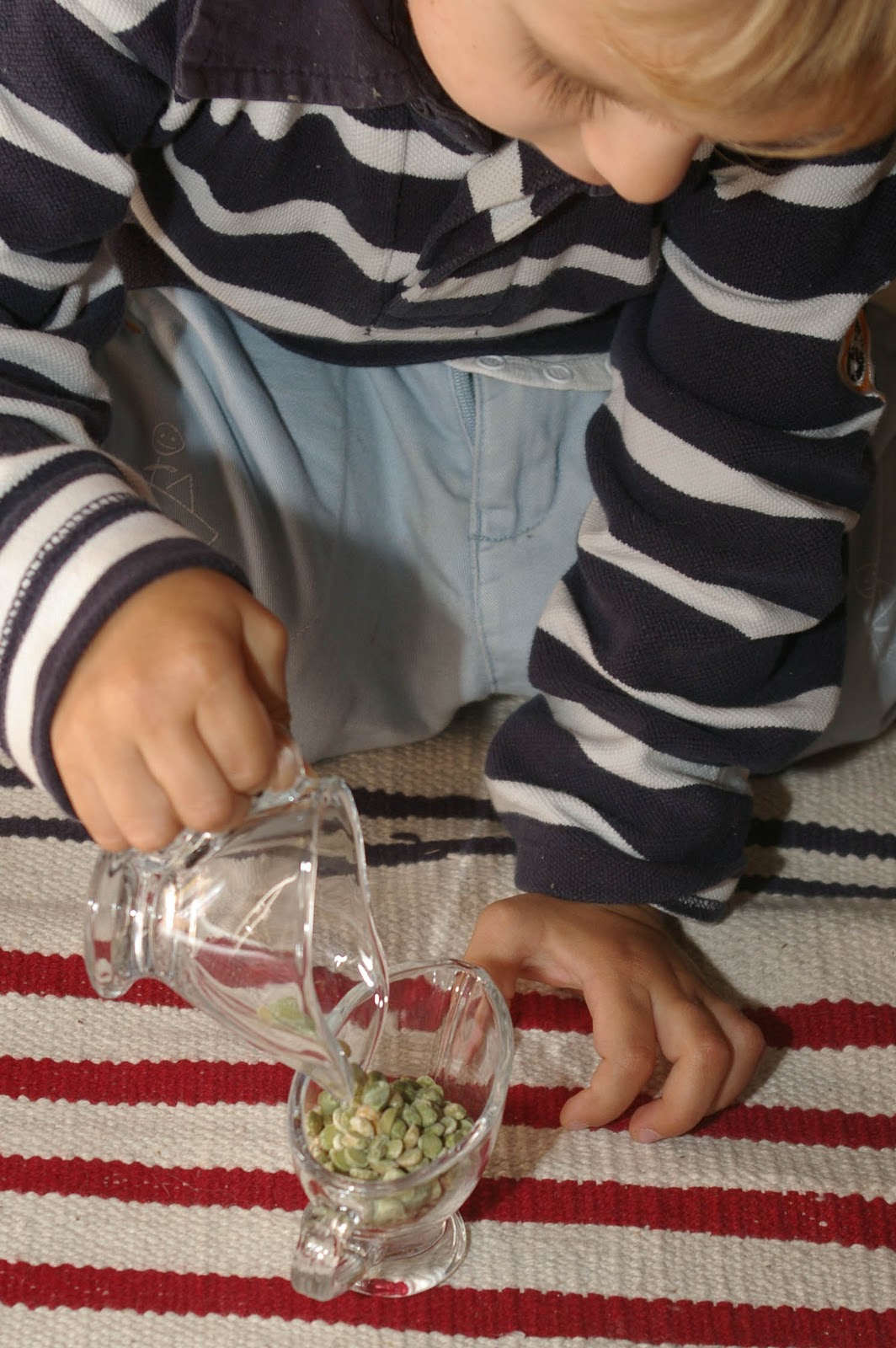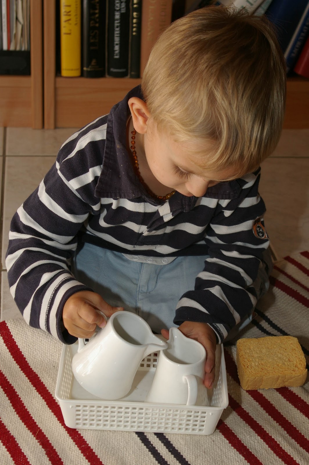 Verser sans cogner les pichets et tenir les pichets par la manche est encore perfectible… mais c’est pour cela que nous mettons à disposition de telles activités à nos enfants… D’ailleurs c’est une grande première, puisque c’est la première fois qu’un plateau “à eau” est en libre accès. J’ai jusqu’à présent toujours préparé les plateaux “à liquides” sur demande. Je les rangeais moi-même après utilisation… Mais Grégoire est très attentionné et il n’a pas encore détourné cette activité…
