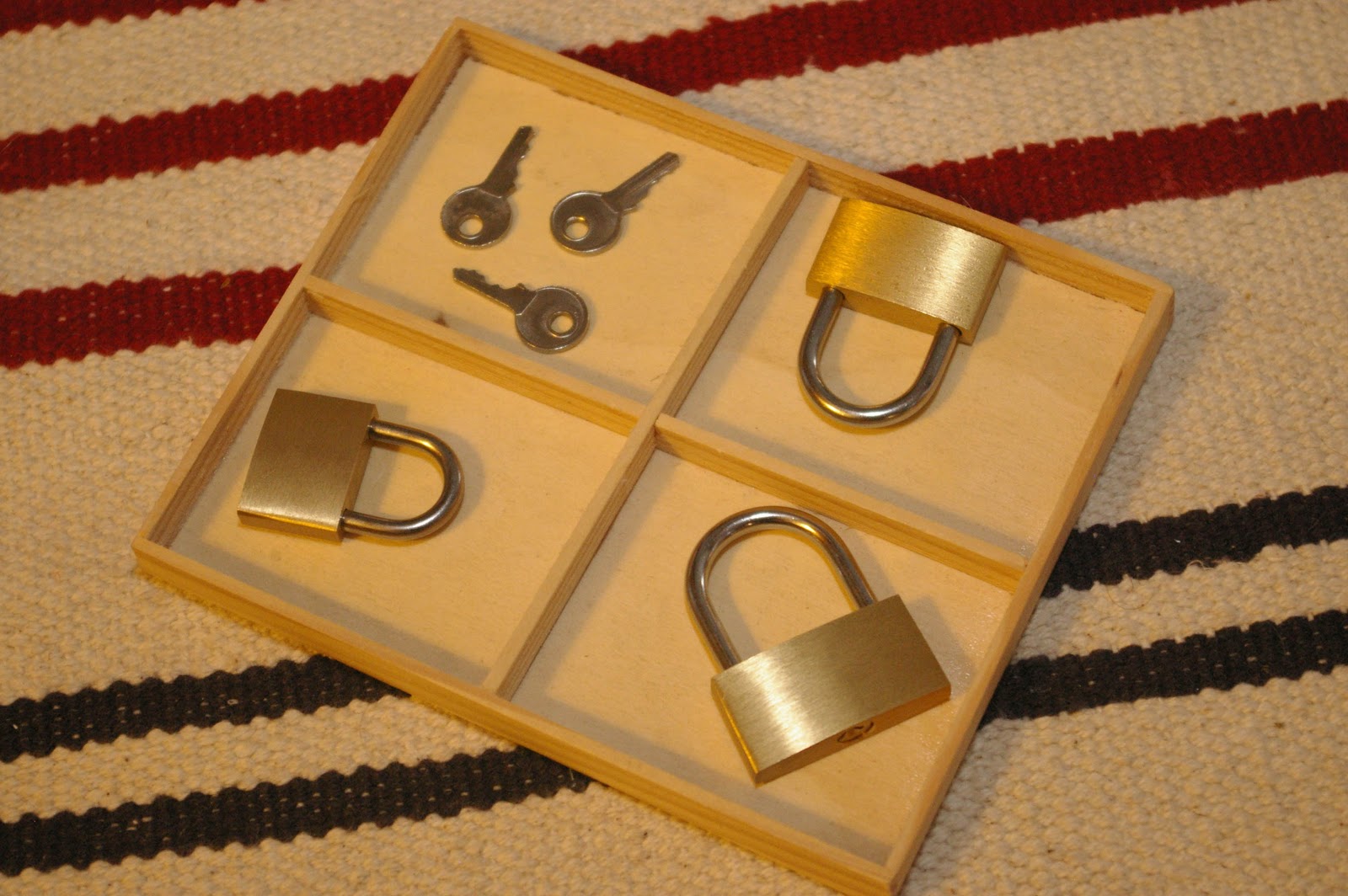 cadenas avec des clés pour que Grégoire s’entraine à manipuler et utiliser un outil pour ouvrir et fermer. Avec passion, il met la clé dans le trou (en plus il faut bien essayer les clés, puisque les différences de taille sont plus que minimes), il essaye de tourner, mais ces cadenas bon marché ont le vice de ne s’ouvrir que difficilement. Il y en a un avec lequel j’ai moi-même du mal … la prochaine fois j’y mettrai le prix.. ou alors je changerai de fournisseur (de mémoire les miens viennent de la Foire Fouille).
