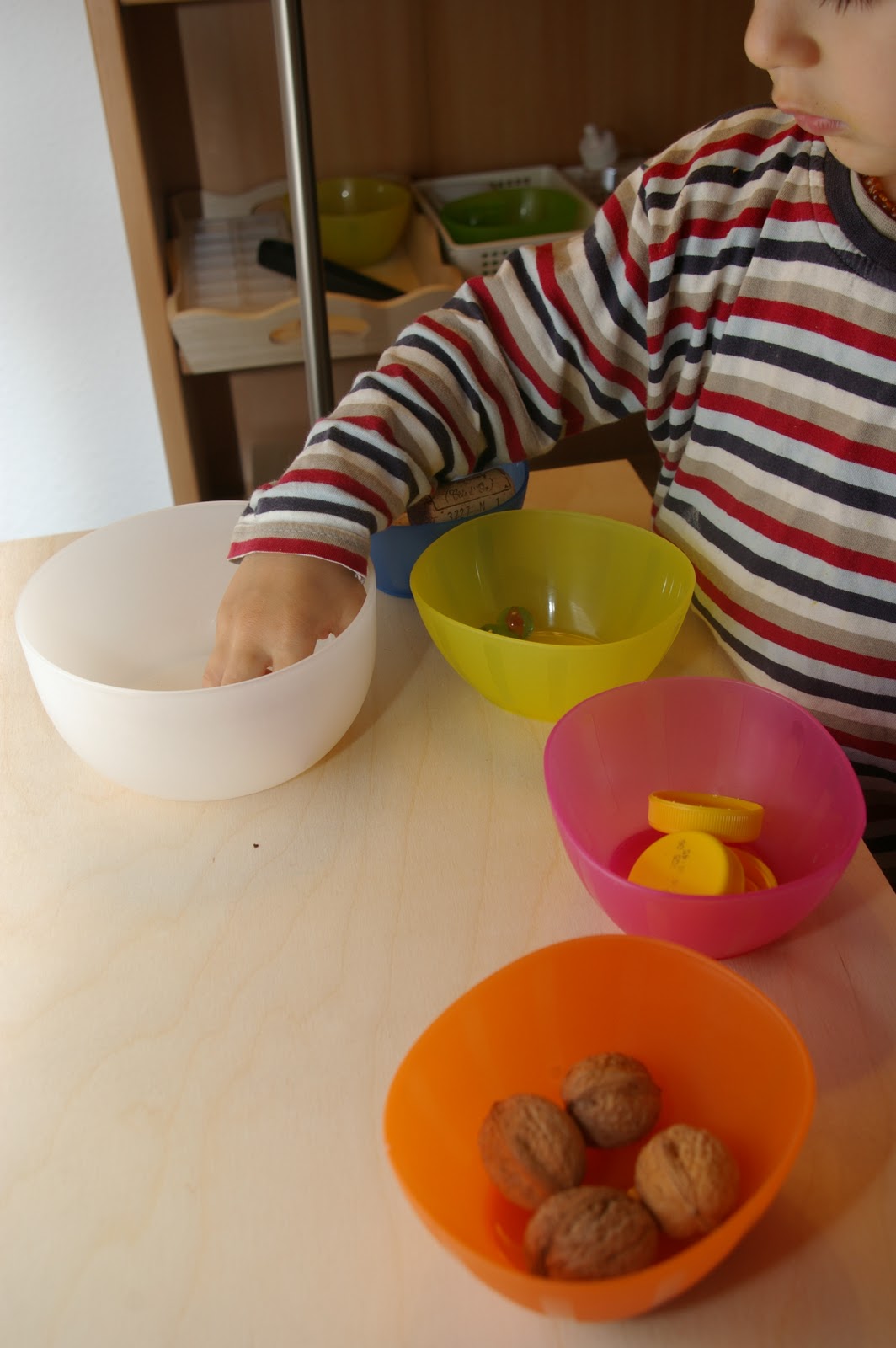 Grégoire parfois se la joue rigolo: il met exprès un objet dans le mauvais bol, me regarde, regarde le bol et fait une tête en disant “mais c’est quoi ça, lala??”. Il a limite les yeux qui sortent et il montre tout son étonnement…
