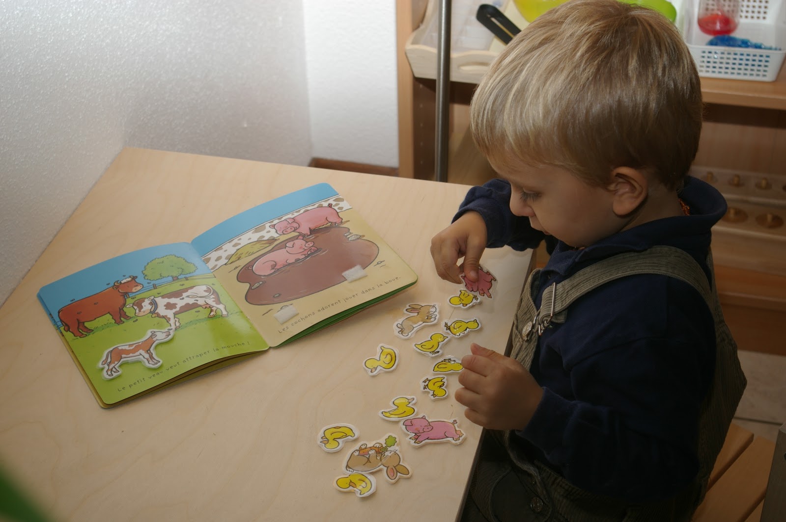 J’ai acheté depuis plusieurs mois trois petits livres de Fleurus, des livres avec des autocollants. Nous avons la ferme, les couleurs et les animaux familiers. J’ai plastifié les autocollants, découpé et mis du velcro pour que cela dure plus longtemps…