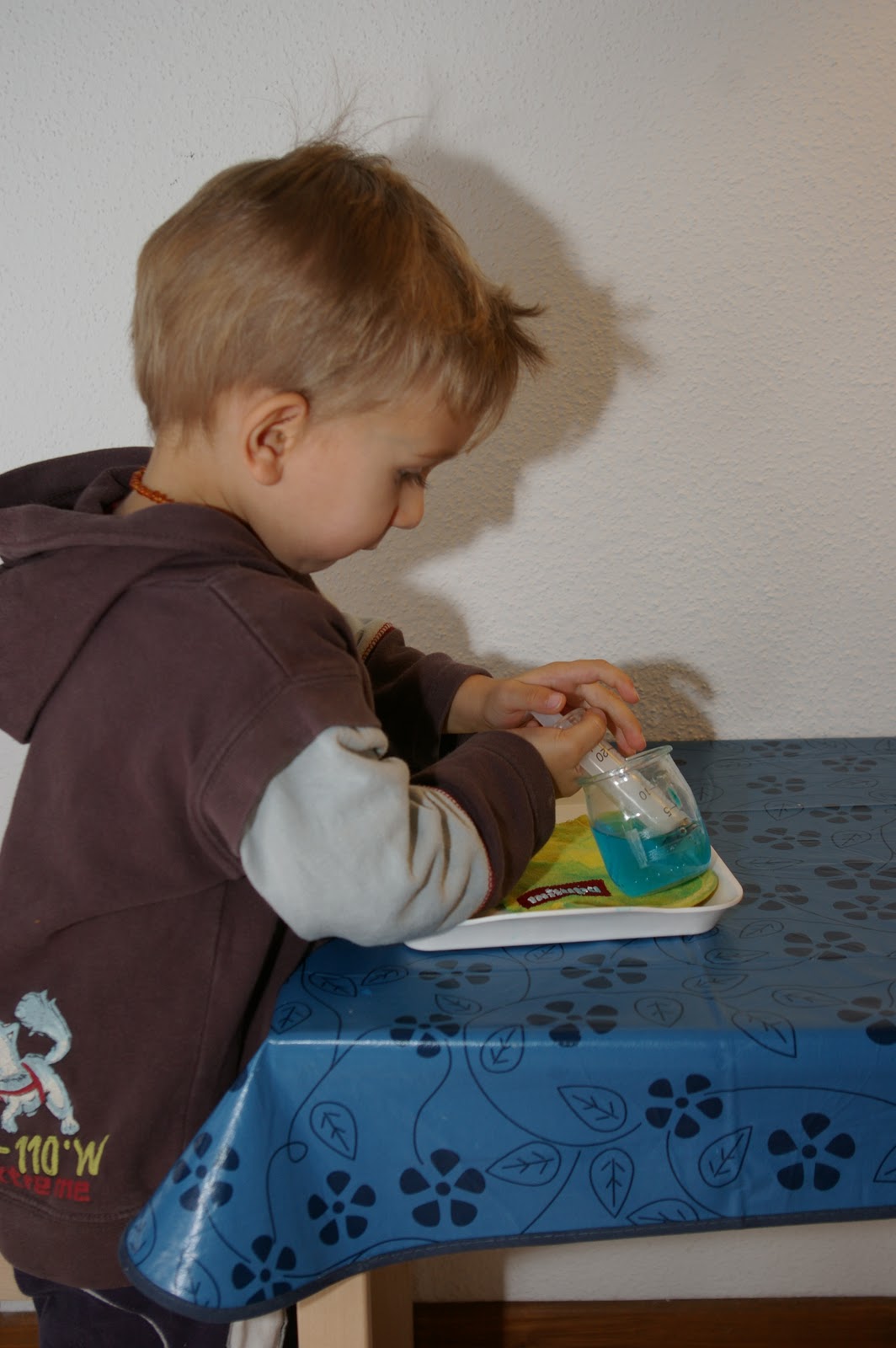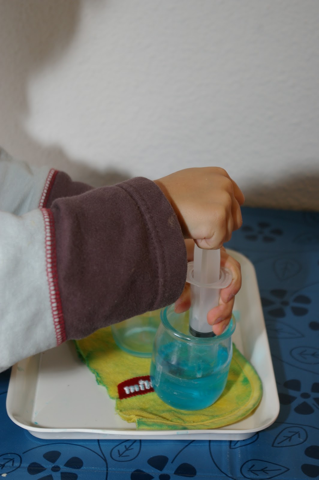 Une des activités bien appréciée de Grégoire en ce moment est la seringue… Remplir un gobelet avec une seringue en aspirant de l’eau coloriée pour la “presser” ensuite dans le gobelet vide.