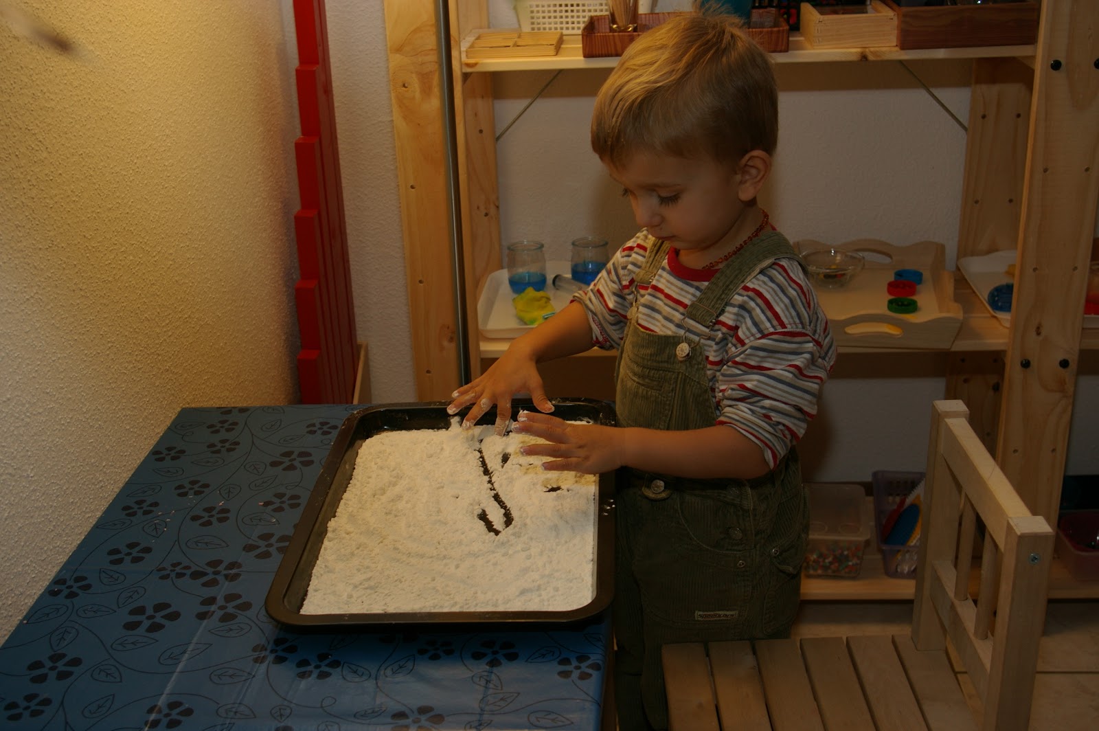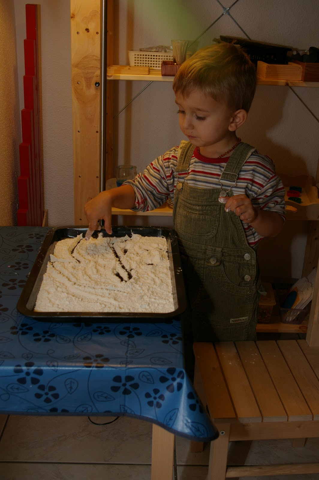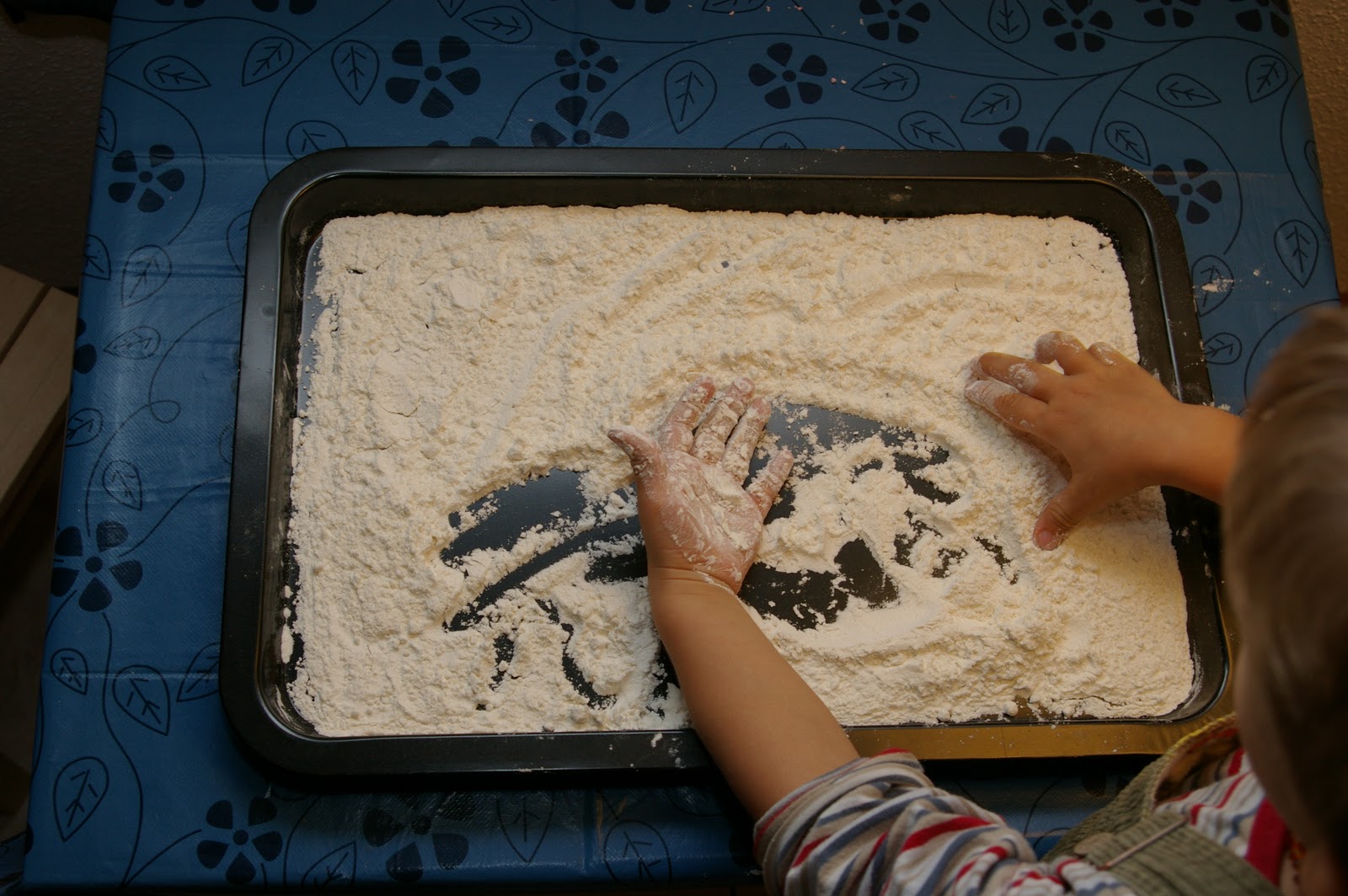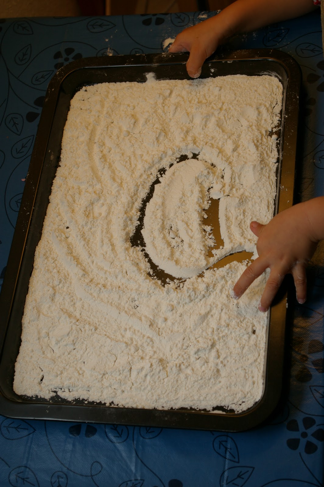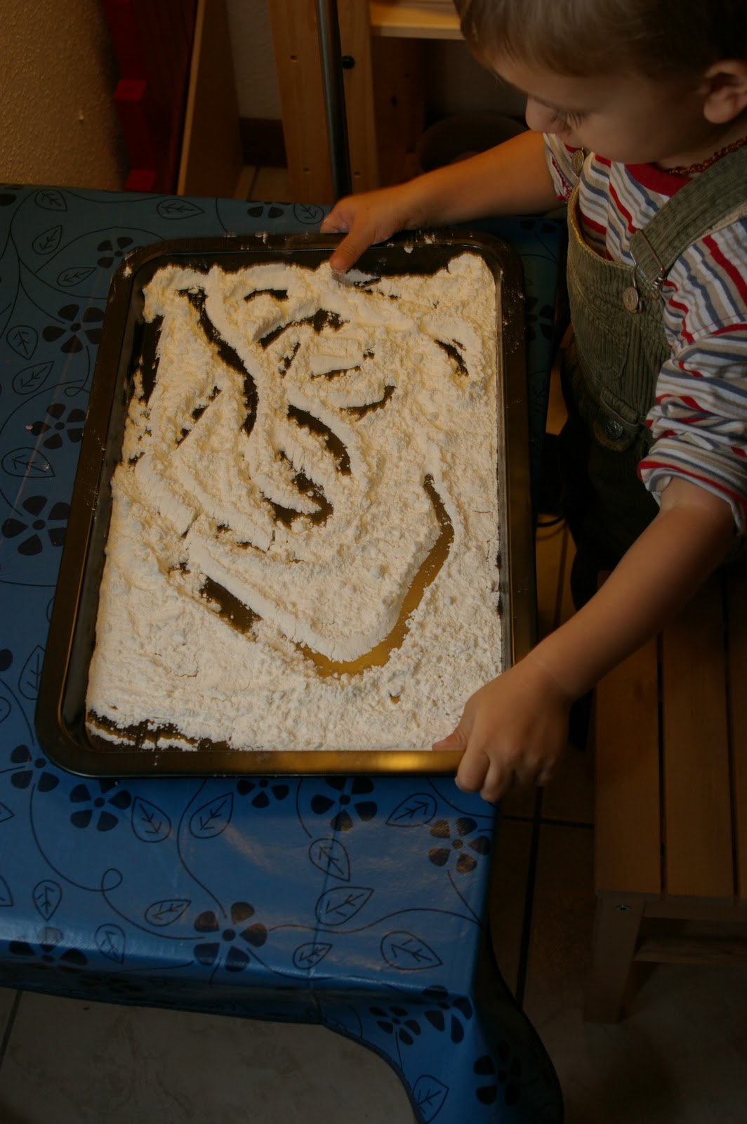 Lorsque l’on fait des traits avec les doigts, le fond noir apparait et fait un joli contraste avec le blanc de la farine.