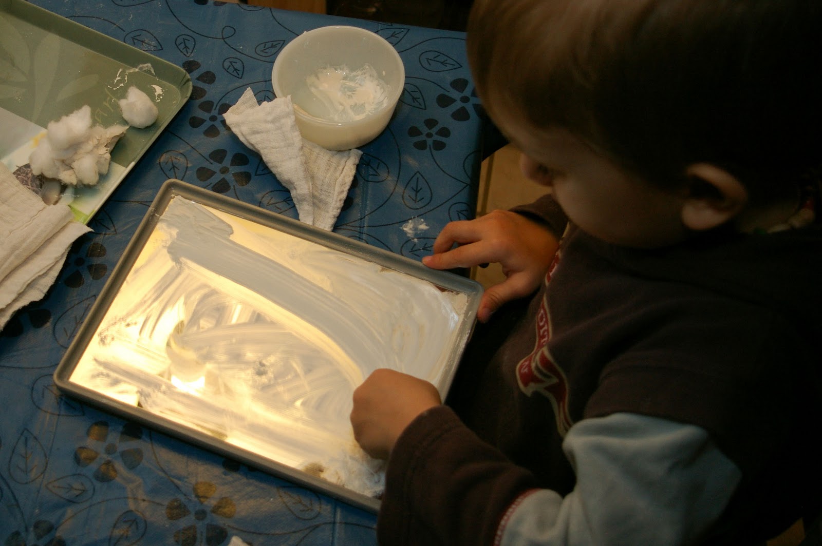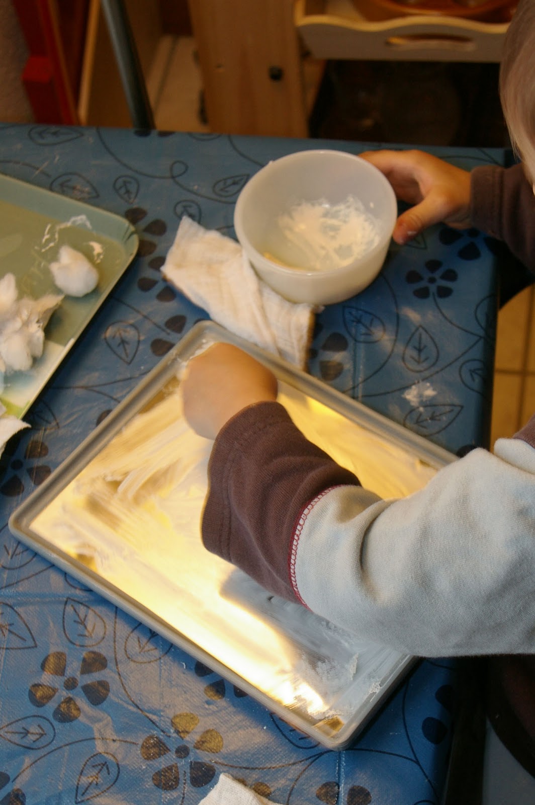 Nous avons commencé avec des boules de coton pour étaler la blanc de Meudon, mais Grégoire n’était pas content pour deux raisons: le coton colle avec le produit, donc pour étaler, il faut bien appuyer pour que le coton reste entier… sans quoi une partie colle avec le produit au miroir… La deuxième raison était que si on ne fait pas attention, les mains se salissent… et comme notre bonhomme a horreur des mains sales il a commencé à “couiner”…
