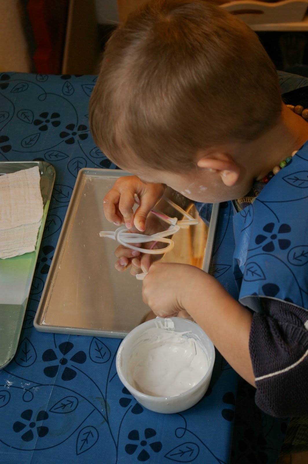 J’ai donc pris des cotons tiges avec lesquels il étale bien le blanc de Meudon. Mais s’il utilise les deux cotés du coton tige, il se plaint à nouveau d’avoir les mains sales… Le problème des cotons tiges c’est que cela demande de la concentration et  de l’endurance… Alors souvent Grégoire me demande de finir d’étaler le blanc… Il faut que je trouve un moyen d’étaler le blanc avec un “instrument” plus gros qu’un coton tige et que l’on peut utiliser sans se salir les mains Si vous avez des idées… je prends!