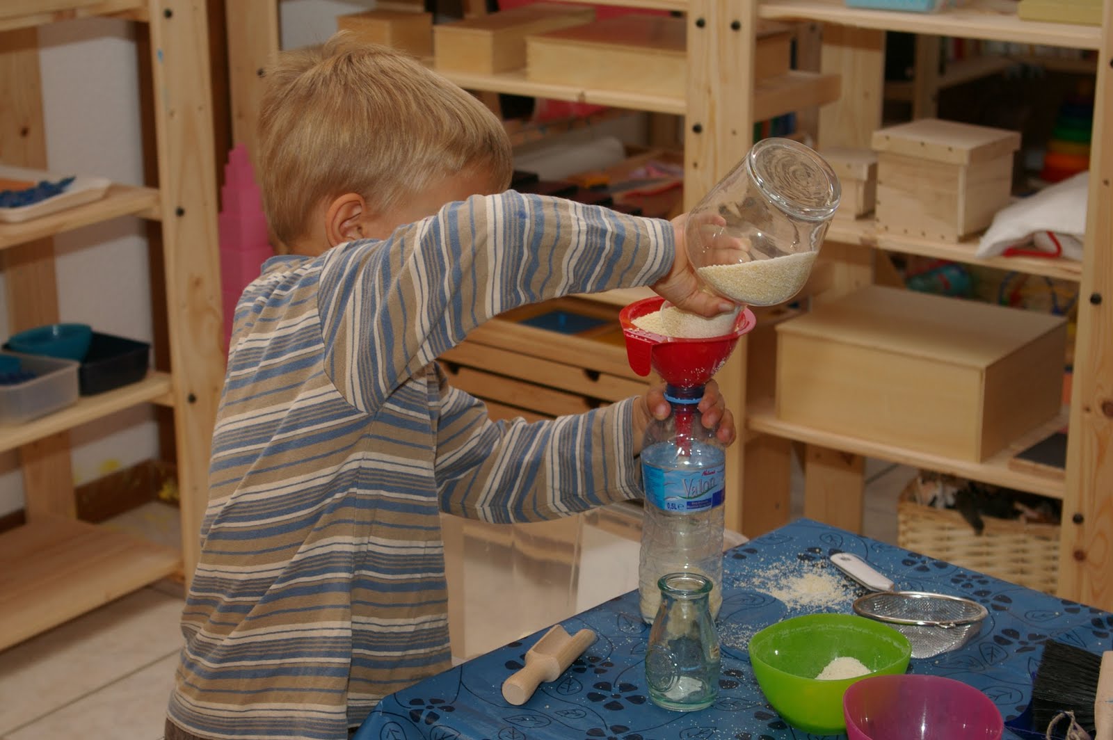Apparemment, les versées l’attirent, mais pas sous le format de plateaux montessoriens, j’ai donc jonglé un peu avec ce que j’avais sous la main et cela a donné: un bac avec de la semoule et couscous mélangé et divers contenants, cuillères etc pour qu’il puisse remplir, vider, verser, tamiser (eh oui, la semoule passe, mais pas le couscous…). Grégoire était occupé pendant presque 1h, chose qui n’est plus arrivé depuis trèèèèès longtemps. Je focalisais trop sur “le matériel vie pratique et sensoriel”, mais visiblement ce n’est pas encore cela qui répond à ses besoins. C’est toujours et encore la vie pratique “de la maison” qui le capte. Très bien, j’ai bien enregistré la leçon et on va continuer sur cette voie…