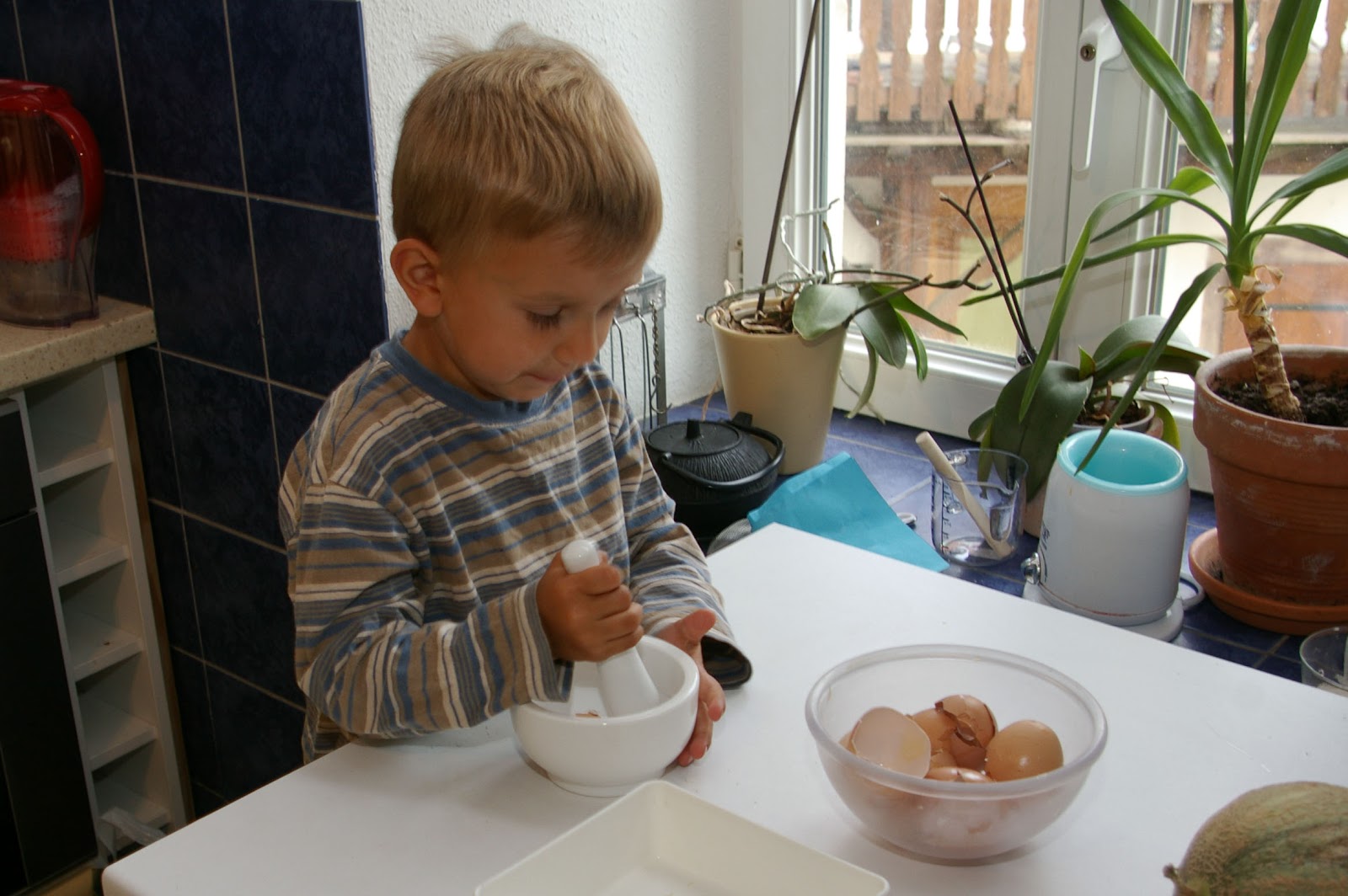 Ce matin j’ai déballé un broyer que j’avais acheté en vue de broyer nos coquilles d’œufs vides et qui se décomposent tellement mal au compost si on les laisse entières. Cela sera dès lors une activité pour Grégoire, qui, m’ayant vu à peine broyer le premier œuf, voulait m’arracher l’outil pour se mettre à la tâche…