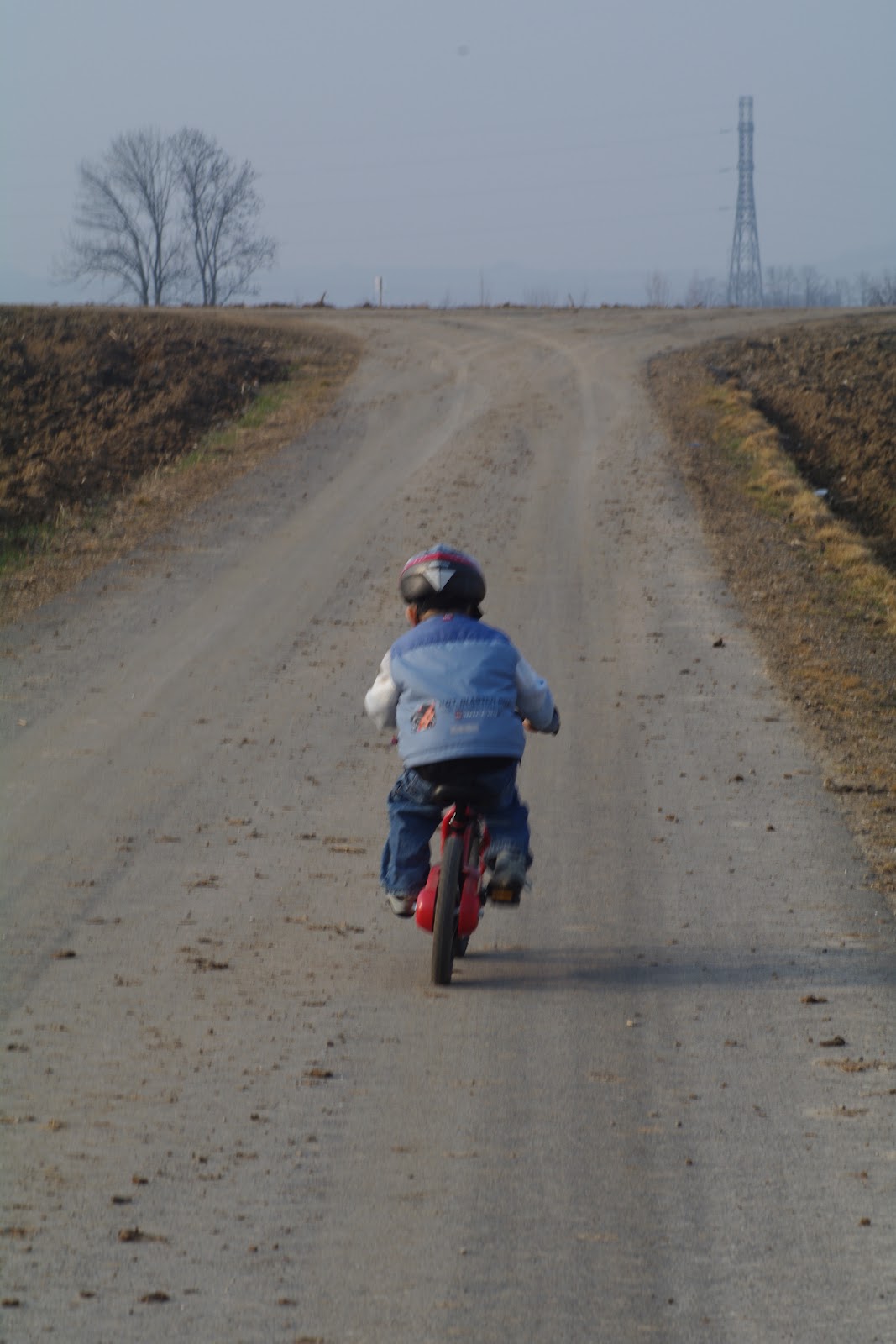 Grégoire fait de la draisienne depuis qu’il a deux ans. Il a certainement plus roulé avec elle qu’il n’a marché à nos côtés… De fait, il était très à l’aise dessus et les promenades que nous faisions duraient parfois très longtemps. Cela fait plusieurs mois que Grégoire garde parfaitement son équilibre sur la draisienne en levant les deux jambes et en s’essayant à quelques figures de style.
