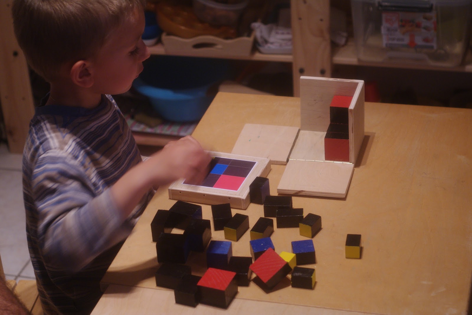 Grégoire sait faire le trinôme, même en mettant en bazar les cubes… Jusqu’à présent il avait du mal à le monter entièrement si les cubes n’étaient pas bien rangés