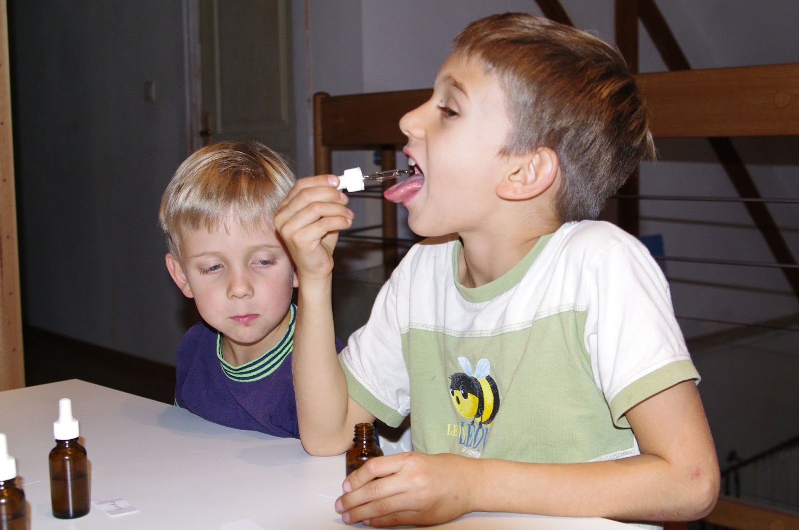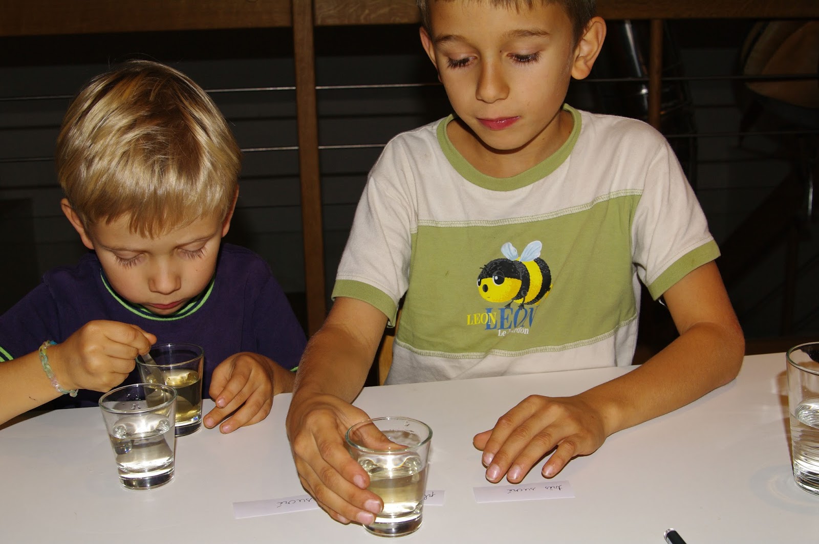 Les enfants les gouttent l’un après l’autre. On essaie ensuite, après le premier test, d’attribuer les étiquettes correspondantes au contenu.