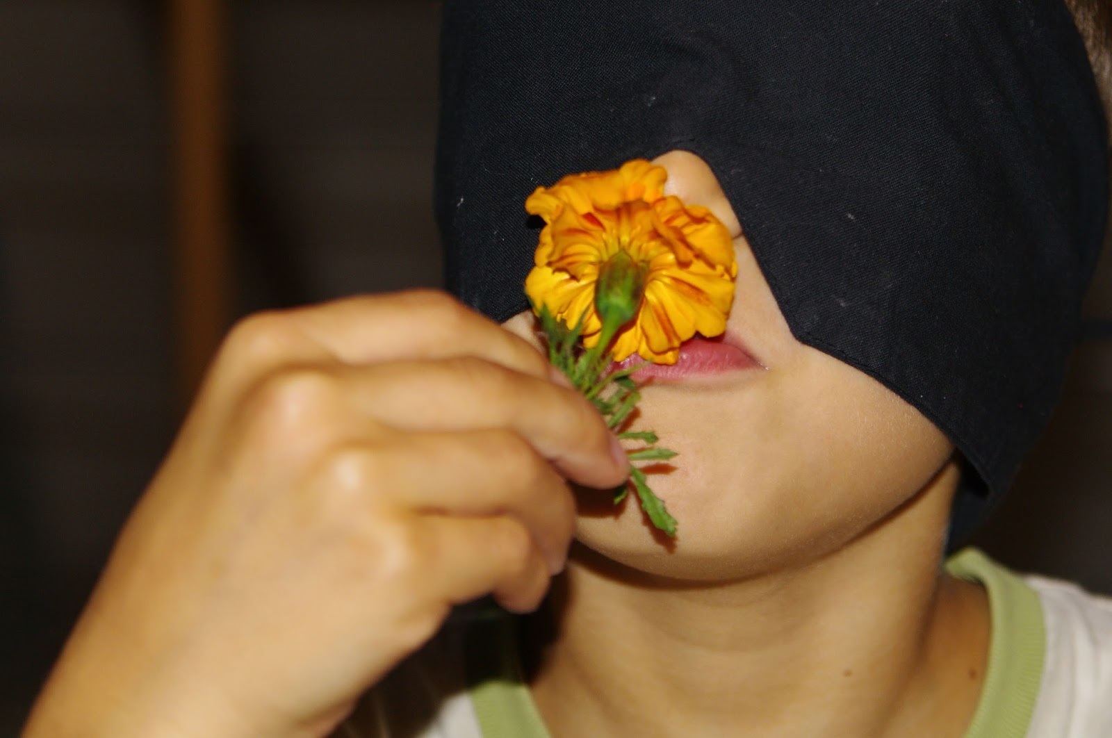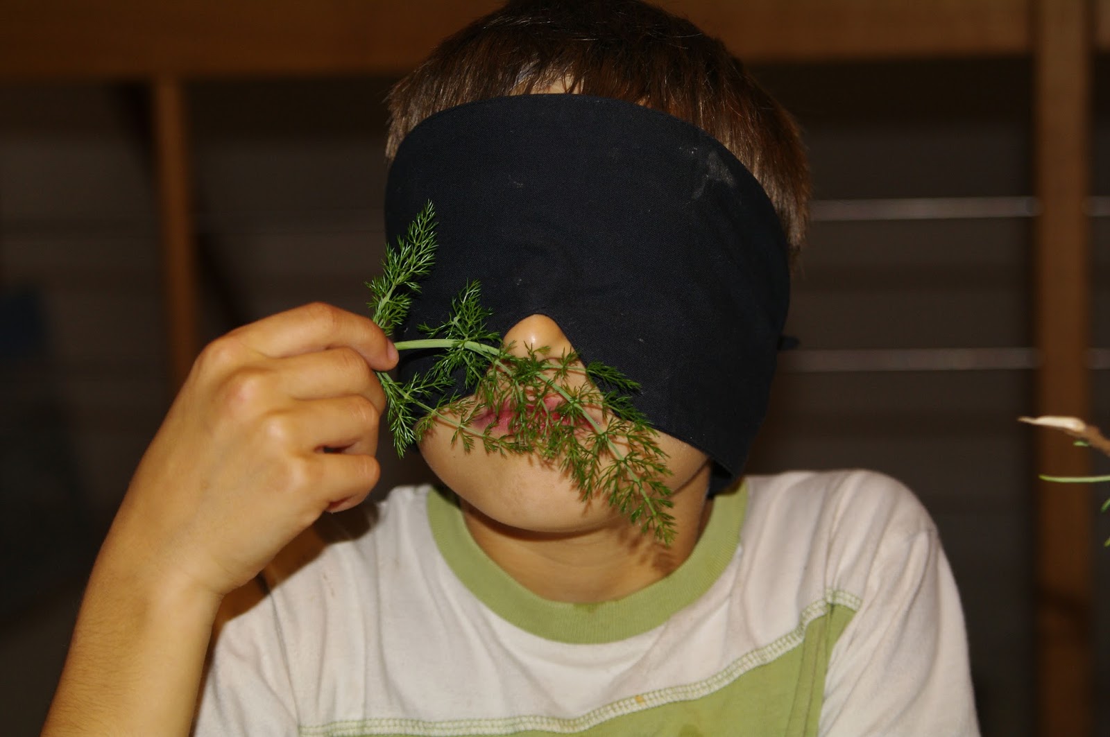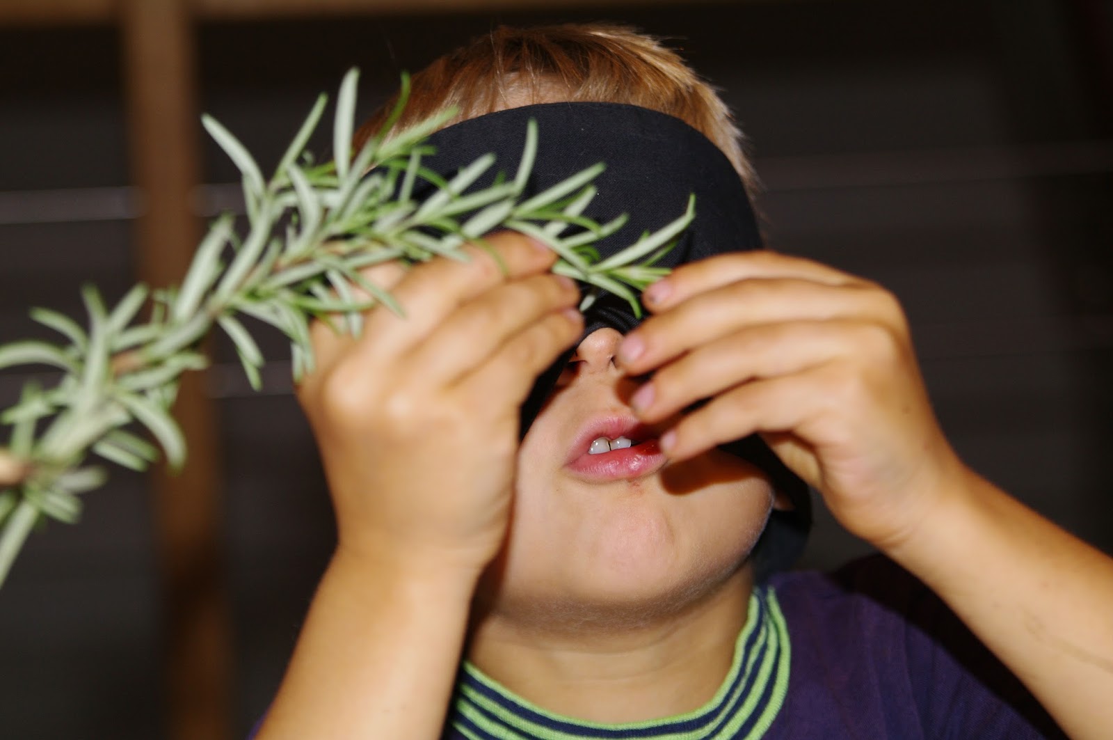 Nous poursuivons notre découverte des 5 sens avec l’odorat. Afin de ne pas perturber le sens, les garçons ont bandé leurs yeux et je leur ai confié différentes herbes aromatiques et fleurs du jardin.