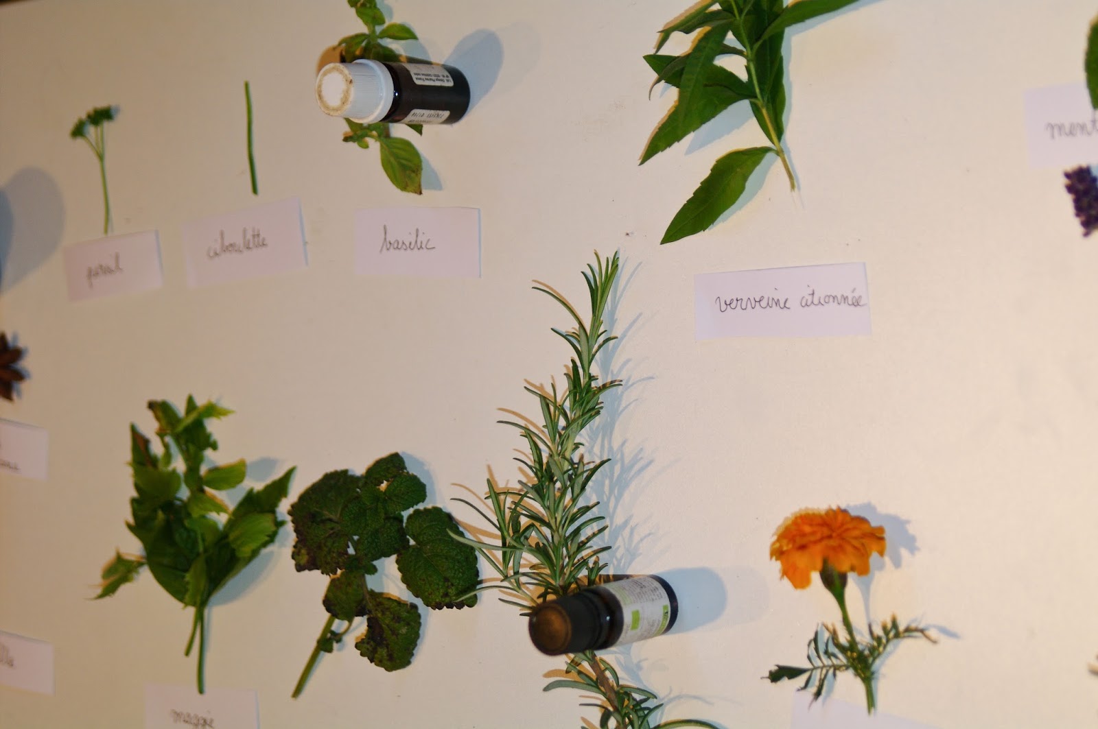 Ensuite, les enfants ont retiré leur bandeau et nous avons essayé d’attribuer des étiquettes à chacune des herbes. Si à l’état naturel les plantes ont parfois une odeur plus ou moins forte, les enfants ont remarqué que les épices (qui sont les fruits, les racines ou les bulbes d’une plante) ont une odeur beaucoup plus intense liée aux arômes. Pour quelques plantes, nous avons aussi testé les huiles essentielles. Les enfants ont pris conscience que reconnaître une essence n’est pas toujours simple.
