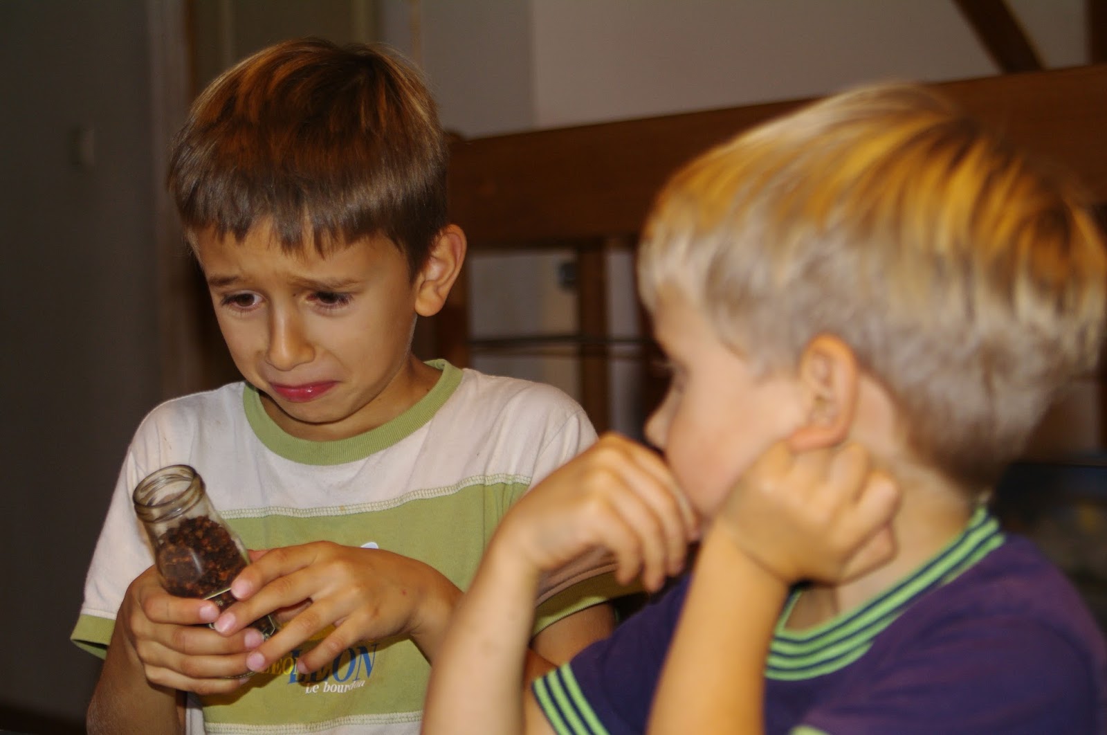 Après, j’ai proposé aux enfants l’activité Montessori pour l’odorat, à savoir les flacons senteurs. L’enfant ne peut pas reconnaître à la vue ce que contiennent les petits pots. J’ai pris du coton que j’ai légèrement imbibé de quelques gouttes d’huiles essentielles. Attention, certaines huiles essentielles sont contre-indiquées pour les enfants!..