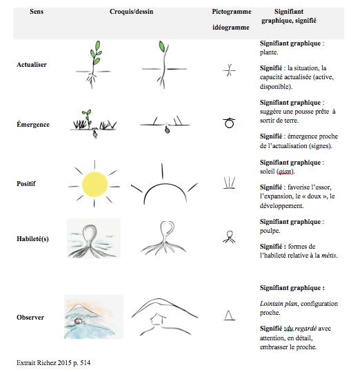 Le principe est aussi « simple » qu’efficient, bien que le développement de cette écriture soit le fruit d’une lente maturation (cinq années, huit mille heures de travail). Yves Richez s’est inspiré à la fois des signes hiératiques égyptiens, des idéogrammes chinois d’un côté, et de ses nombreuses observations lors de voyages de l’autre pour développer ces caractères : « nous avons dessiné, au fur et à mesure de l’observé, des croquis que nous avons simplifiés de sorte qu’il soit possible de produire un caractère. Avec les mois, nous avons cherché à dessiner, de manière simplifiée, l’observé (signifiant graphique) ou l’idée (signifié), en gardant à l’esprit les principes chinois et égyptiens » (ibid. p.516). Nous pouvons découvrir ci-dessous cinq exemples montrant le cheminement l’ayant mené du croquis au caractère jusqu’à explicité le sens principal, le croquis et le caractère tel qu’ébauché à ce jour (pictogramme, idéogramme). L’enjeu d’une telle écriture est d’éviter d’apposer sur l’observation les systèmes symboliques de la psychologie classique et en particulier, les classifications hiérarchiques fondées sur un modèle du « bon » et du « moins bon ». Yves Richez montre que ce modèle, outre son obsolescence théorique, relève d’une « erreur catégorielle », c’est-à-dire mélangeant deux univers n’ayant rien en commun sous prétexte que le concept intellectuel initial les a réunis par commodité.